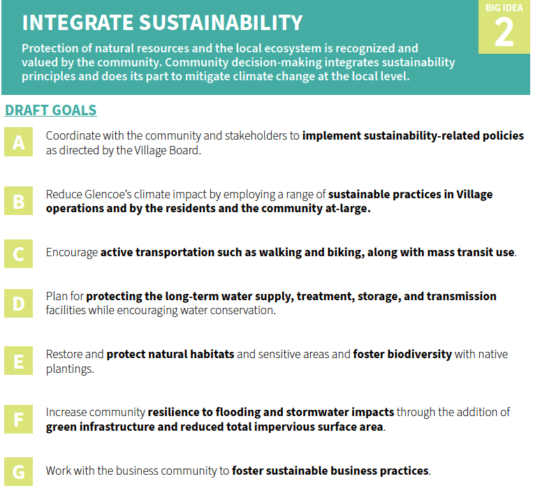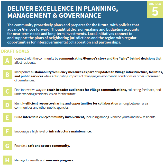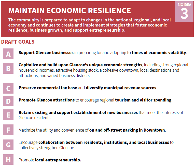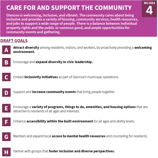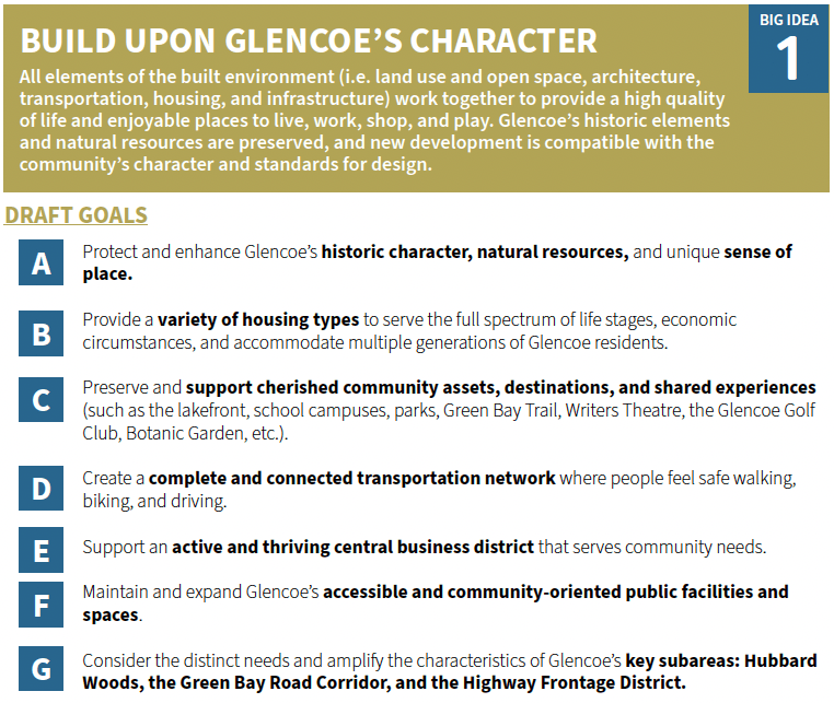 All In, Glencoe will use a set of “Big Ideas” as the guiding framework for the Comprehensive Plan and Glencoe’s future policy direction. These Draft Big Ideas emerged from: community input gathered thus far, consultant team analysis, planning best practices, and discussions with Village staff.